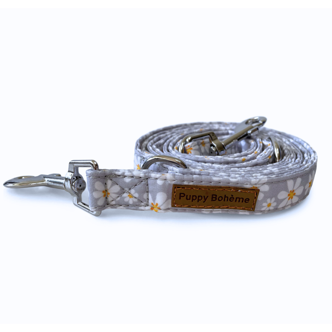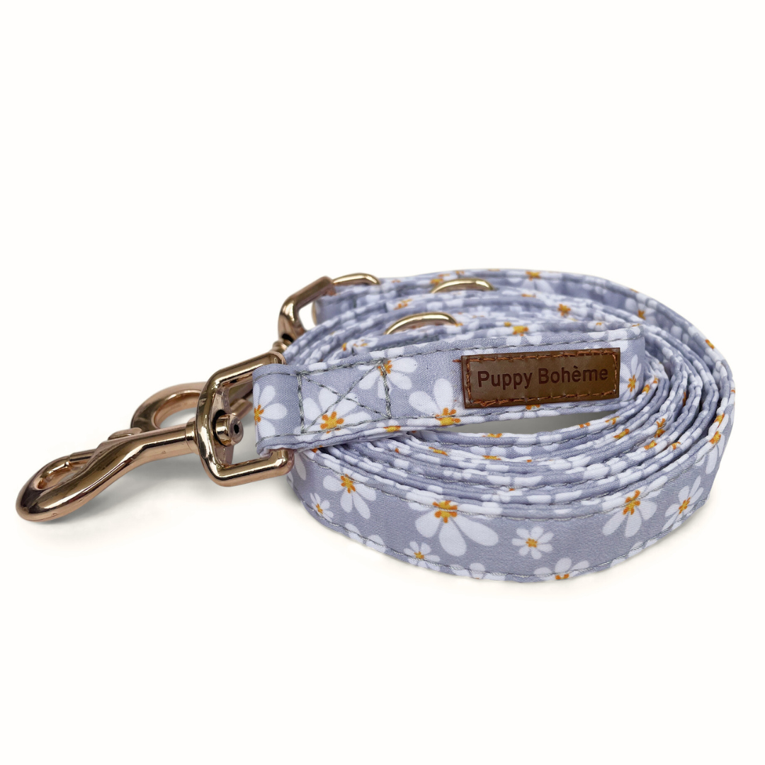 Line i smuk blomster print med gulddetaljer. Linen er 2 meter, men kan justeres i forskellige længder og er perfekt til at lære din hund at gå pænt i snor.