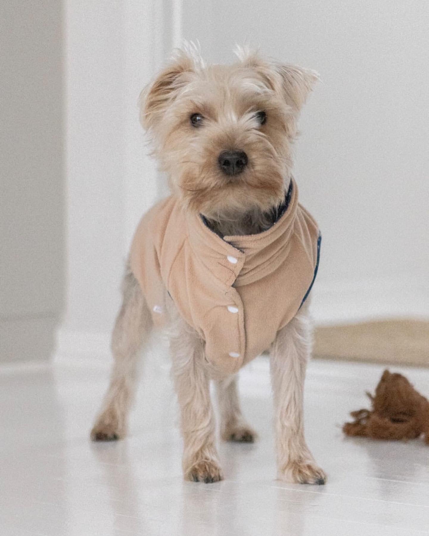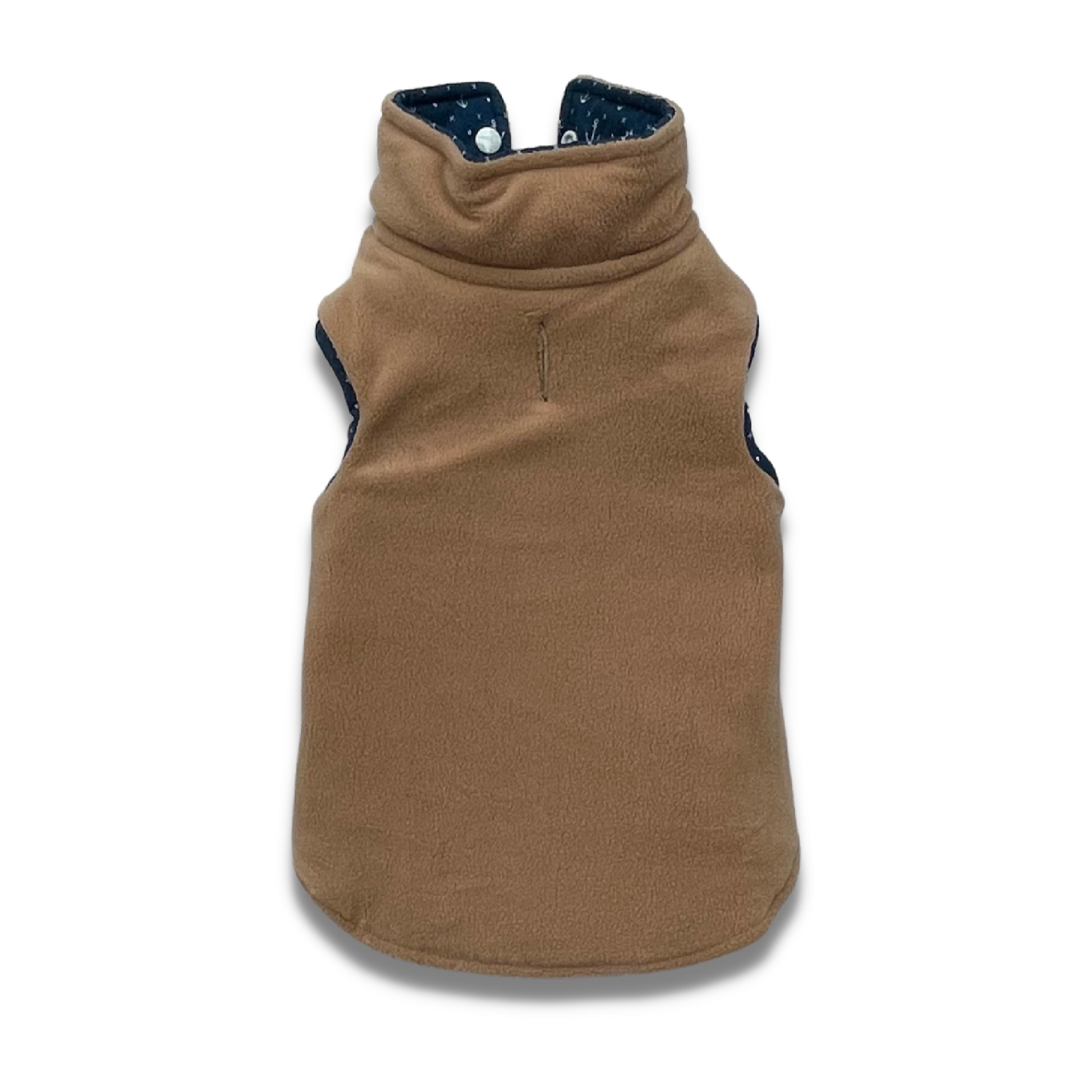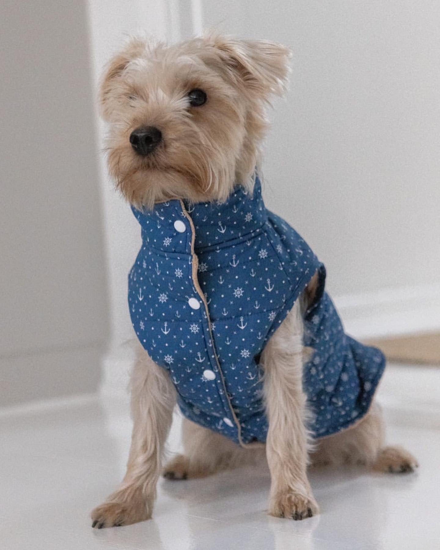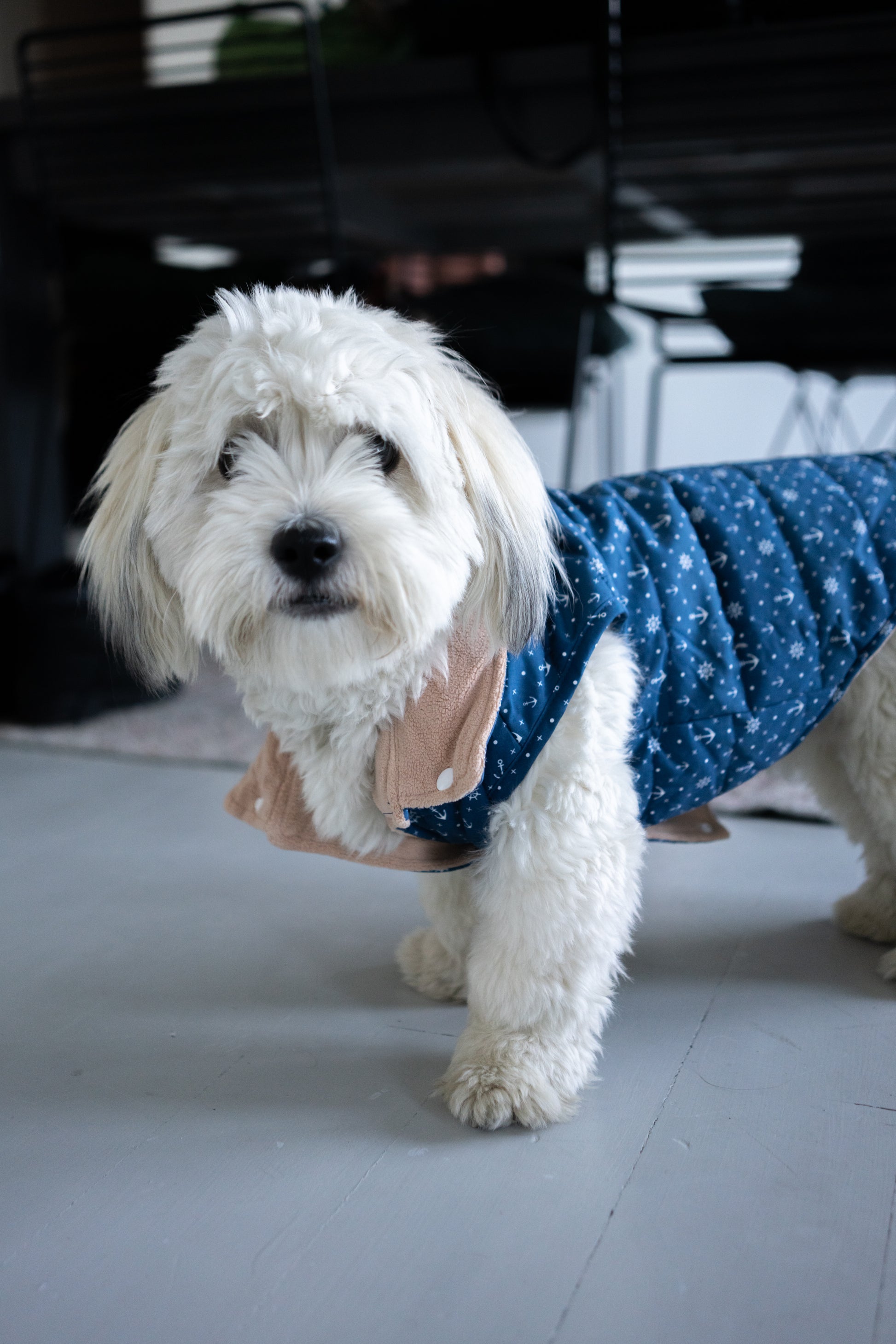 Denne lækre vest er lavet i bomuld, hvilket gør den åndbar. Den har det blødeste teddy fleece på den ene side og sejlerprint på den anden. Den er vendbar, så du får 2 forskellige looks i én. Siden med print har fået en vandafvisende behandling. Den er nem at få af og på, da den ikke skal over hundens hoved og den lukkes med trykknapper på maven. Der er lavet et lille hul på ryggen så hundesnoren kan komme igennem, så hunden kan have sele på under vesten.