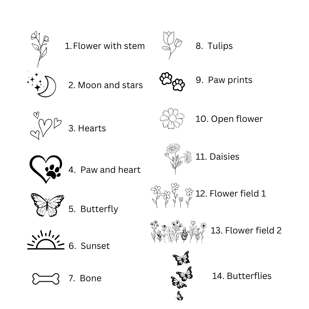 Ja, vi tilbyder flere farve- og motivmuligheder til hundetegnene, så du kan vælge det design, der bedst passer til din hund.