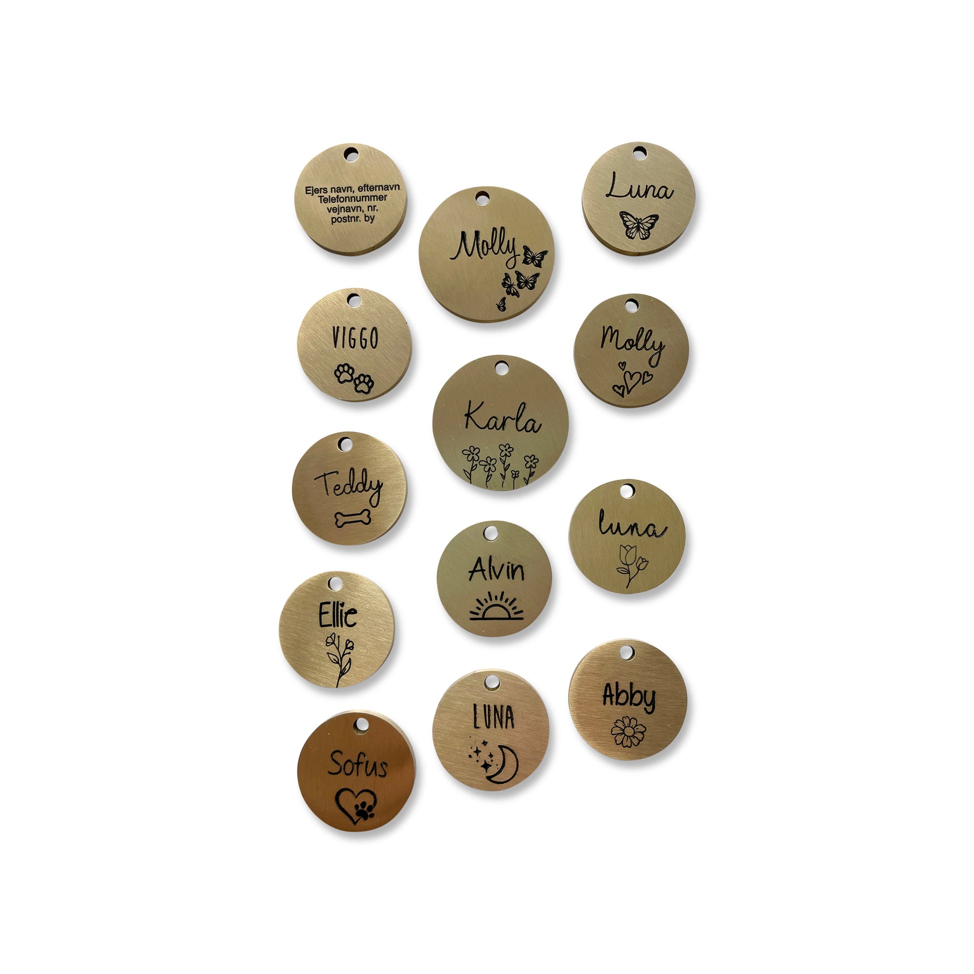 Flotte hundetegn i metal med indgraverede motiver, der gør hundetegnet mere personligt. Vælg mellem mange forskellige motiver og forskellige skrifttyper. På bagsiden er der plads til indgravering af ejers navn, efternavn, telefon nummer og adresse (se billede).