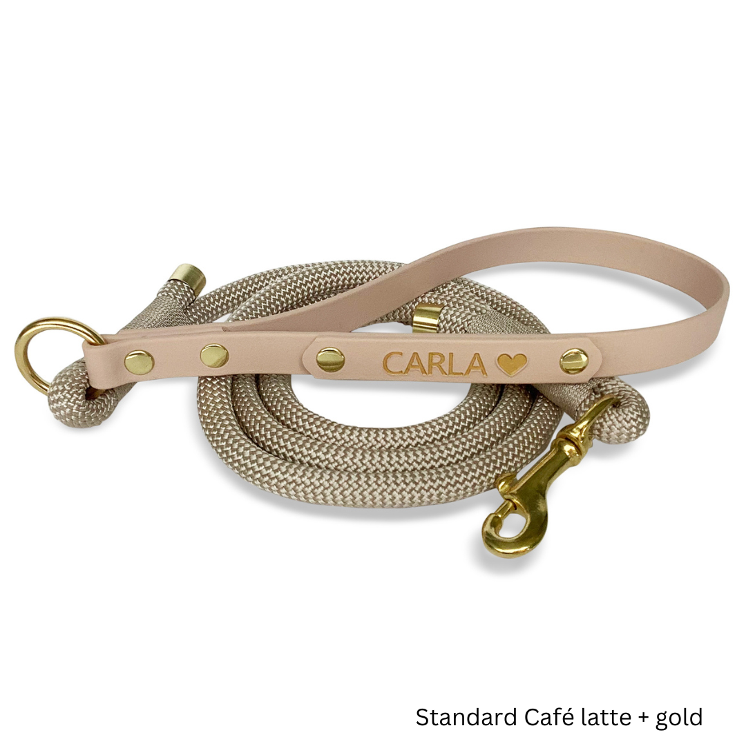 Stilfuld line i holdbart rebmateriale med lækkert Biothane håndtag, som er god at holde på. Vælg mellem mange forskellige farver og gør din hunds line mere personlig med indgravering af fx. din hunds navn eller andet. Indgravering er inkluderet i prisen.