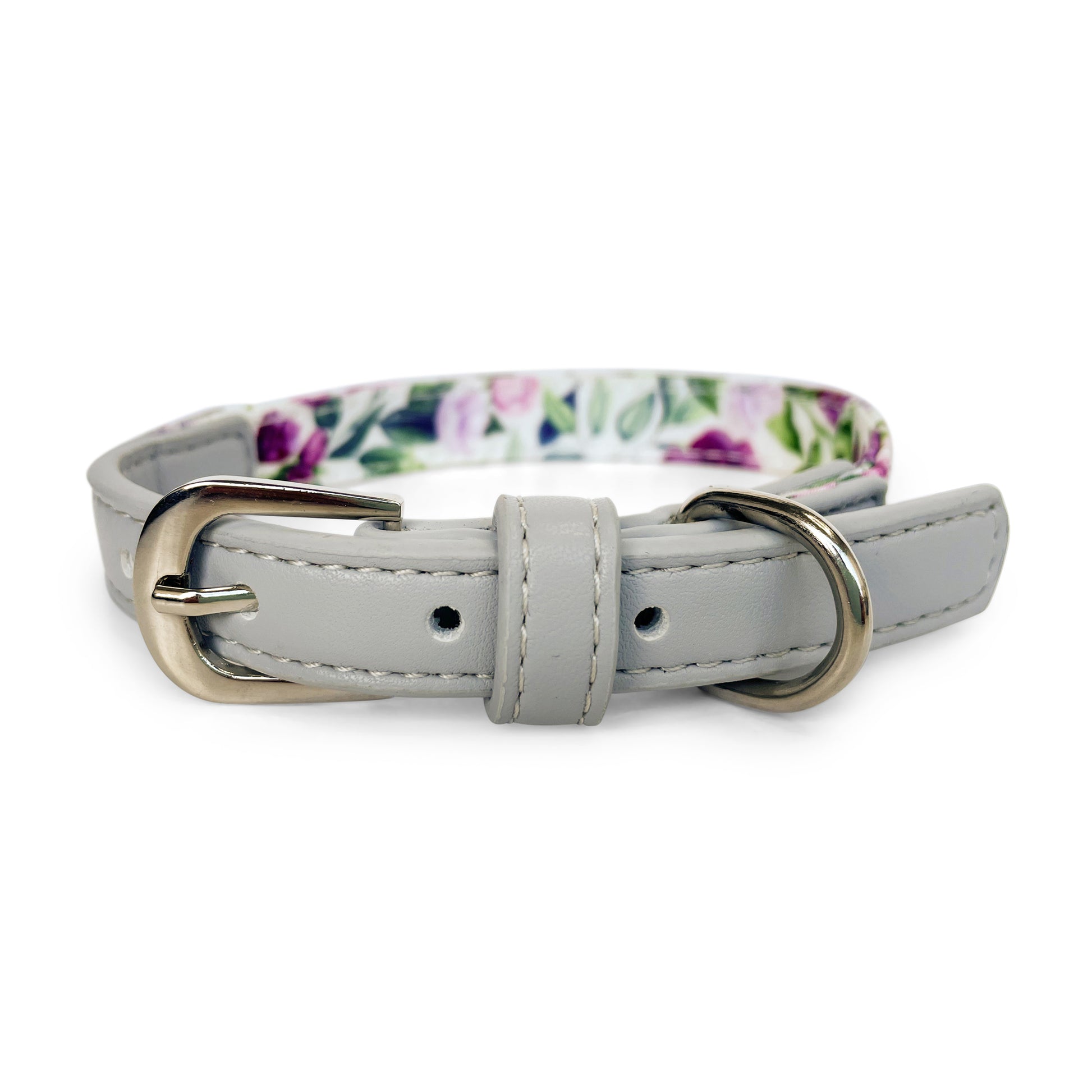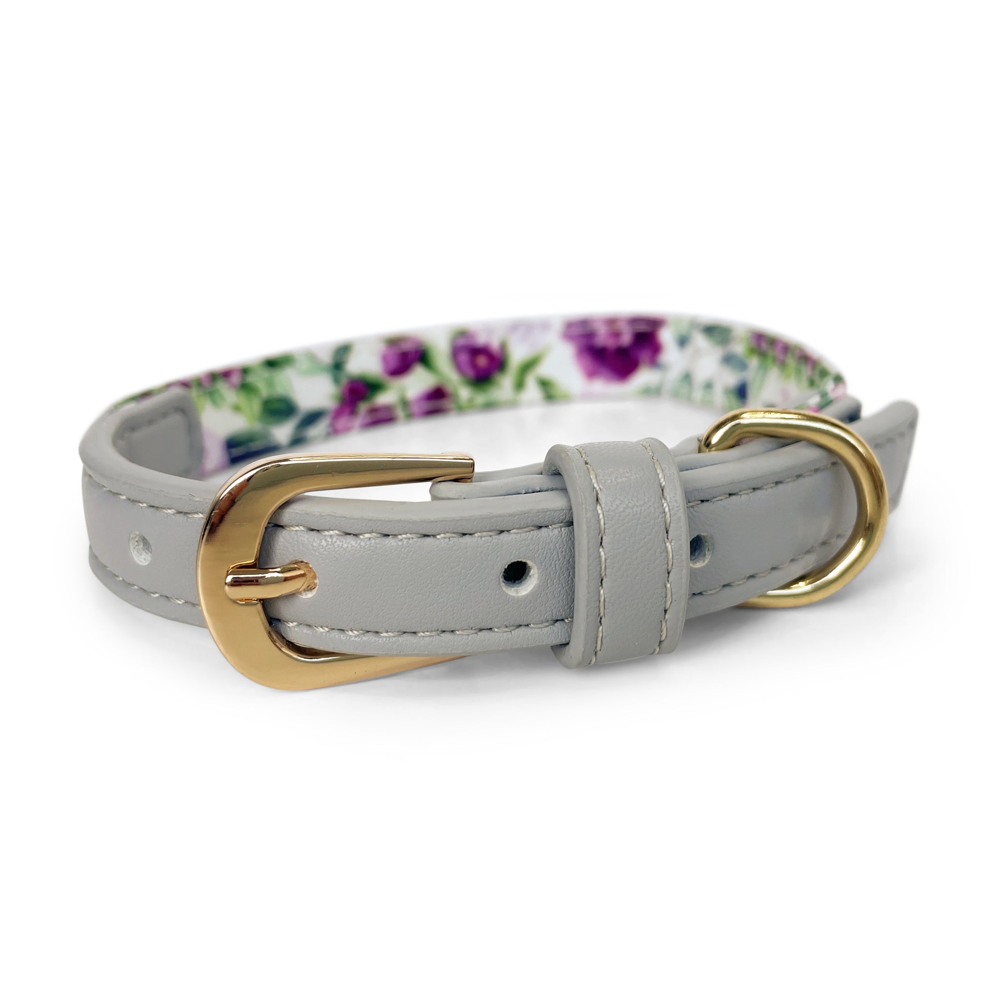 Dette halsbånd er lavet i bomuld, som gør det blødt og behageligt for hunden at have på. Det har vegansk læder lukning og lavet så det er meget let og egner sig derfor godt til små hunderacer. Vælg mellem guld eller sølv spænde.